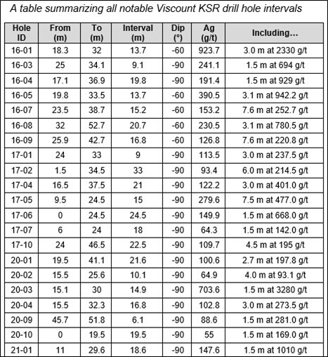 Throughout these six drilling campaigns performed at the Kate, fifty-four drill holes were drilled by Viscount. Of these, twenty-five drill holes presented intervals assaying greater than 110 g/t and ten drill holes displaying intervals assaying over 400 g/t.