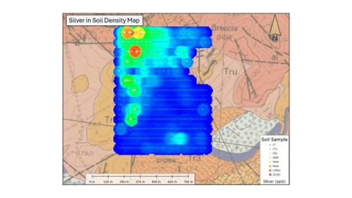 The 2025 geochemical survey, combined with historical drilling, highlights expansion potential to the north and northeast. Historical drilling by previous operators returned numerous multi-ounce silver intercepts occur along the structural extensions near the Jay Gould breccia pipes, indicating the system remains open.