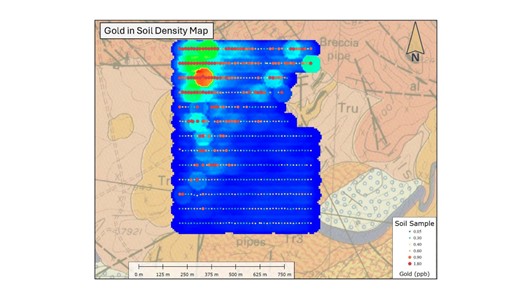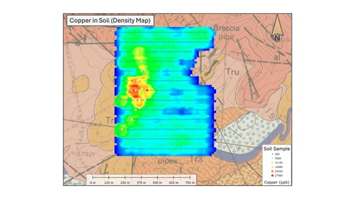 Overlapping clusters of elevated gold-in-soil values coincide with the copper trend and are characteristic of leakage halos above mineralized porphyry centers. This dual response—copper and gold provides increased understanding in the geometry of the subsurface system.